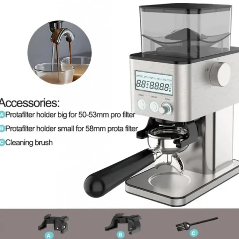 دارای ظرف ورودی مخروطی , دارای برس تمیز کننده , دارای نگه دارنده ی پرتافیلتر دوسایز 23 و 58